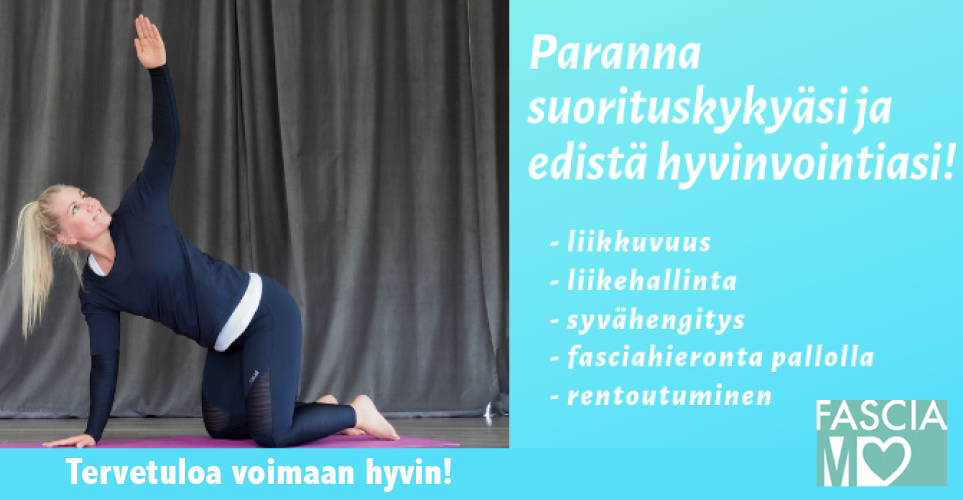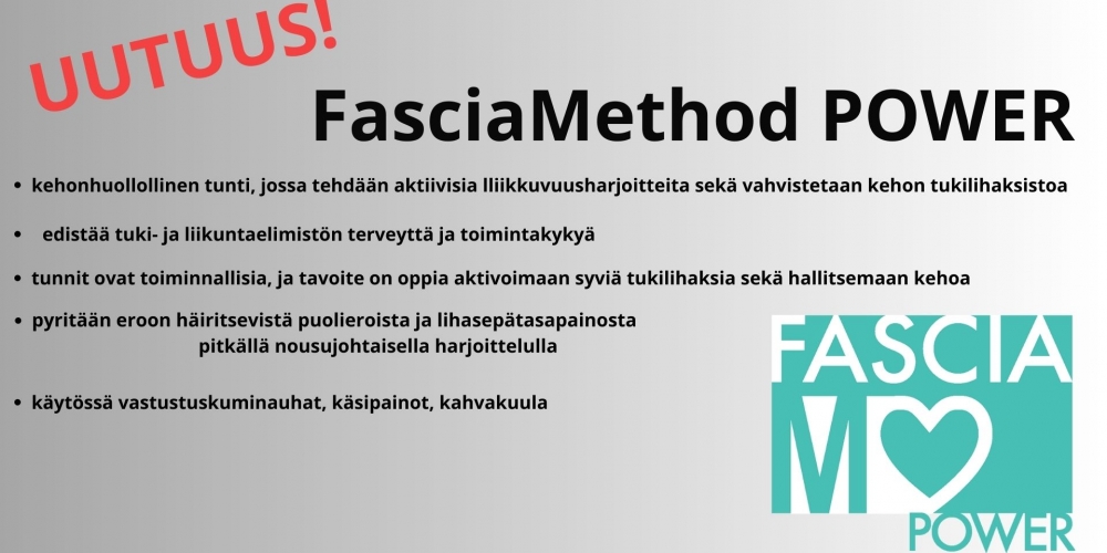 Syksy 2024, FasciaMethod- kehonhuoltoryhmä20.07.2024Suosittuun FasciaMethod- kehonhuoltoryhmään ilmoittautuminen alkanut! FasciaMethod on liikkuvuus- ja liikehallintaharjoittelua, jonka tavoitteena on edistää tuki- ja liikuntaelimistön terveyttä sekä toimintakykyä. Menetelmänä [ lue lisää ... ]